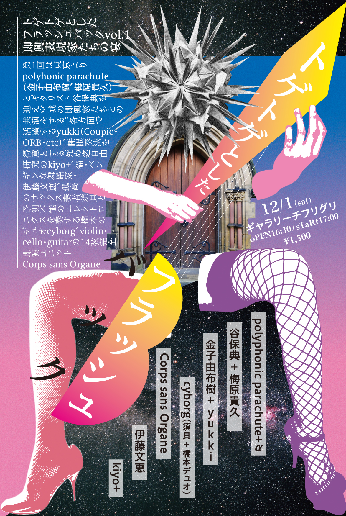 東京よりpolyhonic parachute(金子由布樹、梅原貴久)とギタリスト谷保典を迎え宮城の即興家たちとの共演をする。各方面で活躍するyukki(Coupie・ORB・etc)、睡眠奏法を得意とする死ぬ迄自由研究のkiyo+、猫・ペンギンな舞踏家・伊藤文恵、孤高のサックス奏者須貝と予測不能のエレクトロニクスを奏する橋本のデュオcyborg、violin・cello・guitarの14弦完全即興ユニットCorps sans Organe